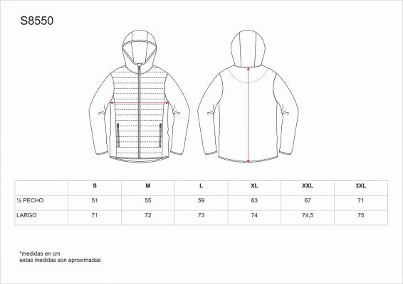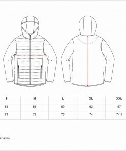 Chaqueta soft-shell combinada con tejido acolchado de estampado camuflaje. Capucha y cubrecosturas interior. Cierre de cremallera de nylon. Solapa protectora interior vuelta en la parte superior cubriendo la cremallera. Dos bolsos laterales interiores con cierre de cremallera de nylon. Capucha, bocamanga y bajo con bies elástico. Abertura para el pulgar. Cremalleras de cierre invertido. Bolsa de transporte con cinta y pieza ajustable.